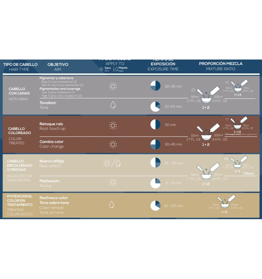 Nakładać na suche lub wilgotne włosy ( w zależności od techniki wykonywania zabiegu i od oczekiwanego efektu ) w proporcji 1+2 lub 1+3. Ważne: produkt o wysokim skoncentrowaniu pigmentu. Proporcje mieszania dobrać dostosowując do kondycji włosów oraz do pożądanego efektu. Po zmieszaniu z większą ilością oksydantu produkt nadal pozostaje gęsty, co zwiększa komfort pracy.