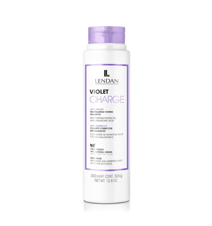Profesjonalny szampon LENDAN Violet Charge korygujący kolor z fioletowymi pigmentami, które ożywiają i wzmacniają chłodne tony oraz neutralizują niechciane żółte tony. Wskazany jest do równomiernego tonowania żółtych refleksów, które pojawiają się w procesach utleniania na poziomach od 8 do 10. Nadaje się zarówno do włosów farbowanych jak i naturalnych.